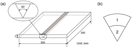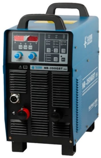 The base metal used in the experiment was NM450TP wear-resistant steel in quenched state. The welding filler material was ER100S-G wire with a diameter of 1.2 mm. The Gas Metal Arc Welding (GMAW) method was used to fabricate the butt-welded joint. The welding machine (NB-350IGBT) is shown in Figure 1. The main chemical compositions of the base metal and welding wire are shown in Table 1 and Table 2, respectively. Figure 2 shows the geometric dimensions of the welded joint and the pass arrangement. The size of the specimen was 300 mm × 300 mm × 7 mm. The groove form was unilateral V-shaped and the groove angle was 60°.