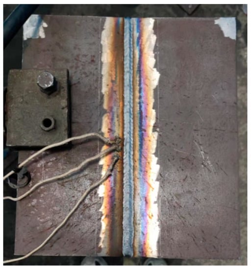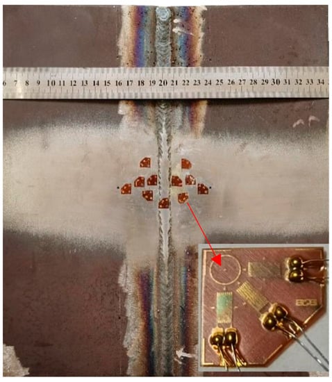 After the welding, the residual stresses were measured using the hole-drilling (HD) method. Figure 4 shows the positions of the residual stress measurements. The type of strain gage was BE120-2CA-K. The parameters of the strain gage were resistance of 120.2 ± 0.3 and gage factor of 2.23 ± 1%. As shown in Figure 3, there were three wire grids facing three directions. The angle of those three wire grids with the welding bead were 0°, 45° and 90°, respectively. Adopting elastic mechanics, the longitudinal stress and transverse stress could be calculated using the measured value of three strain gages [18,19].