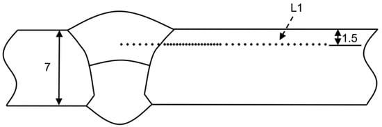 After the residual stress measurement, the specimen was cut from the center of the welded joint and the micro-hardness of the joint was measured. The measurement points were distributed along a line L1 as shown in Figure 5.