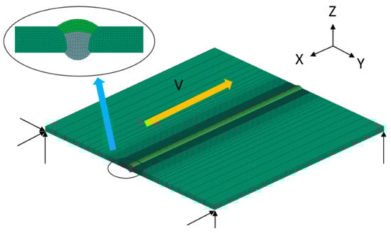 In this paper, a “thermal-metallurgical-mechanical” coupling computational approach was developed based on the software SYSWELD. In the numerical simulation, a finite element model, whose dimensions were consistent with the actual welded joint, was established, as shown in Figure 6. To balance the calculation efficiency and calculation accuracy, fine meshes were used in the weld and its vicinity, and sparse meshes were used in the area far from the weld. All elements were 8-node hexahedral elements, and the number of degrees of freedom for the finite elements in this paper was 24. The numbers of the elements and nodes were 60,000 and 69,794, respectively.