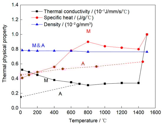 The Newton cooling equation [25] was used to describe the convective heat exchange between the joint and the environment. The Stefan–Boltzmann law was used to describe the radiation heat dissipation of the joint. The initial temperature of the joint and the ambient temperature was set to be 30 °C. The welding parameters used in the simulation were exactly the same as those used in the experiment. Figure 7 shows the thermophysical properties of the martensite phase and austenite phase. These parameters were calculated by the JMatPro software according to the chemical composition of NM450TP wear-resistant steel. Among them, the thermophysical properties of the softening phase was the same as those of martensite [26,27].