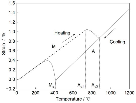 During the heating and cooling process, the NM450TP wear-resistant steel underwent austenitic–martensitic transformation. Figure 8 shows the thermal expansion test results of the NM450TP wear-resistant steel. It can be seen from the figure that the Ac1 temperature, Ac3 temperature, and martensitic transformation start temperature (Ms) were 720 °C, 850 °C, and 525 °C, respectively. The thermal expansion coefficients of martensite and austenite could be determined from the temperature–strain curves in Figure 8. In the numerical simulation, it was assumed that the thermal expansion coefficient of the softening phase was the same as that of the martensite. The Johnson–Mehl–Avrami relation [28] and the Koisten–Marburger relation [29] were used to describe the austenite transformation process and the martensitic transformation process, respectively.