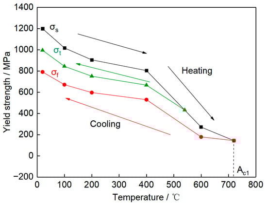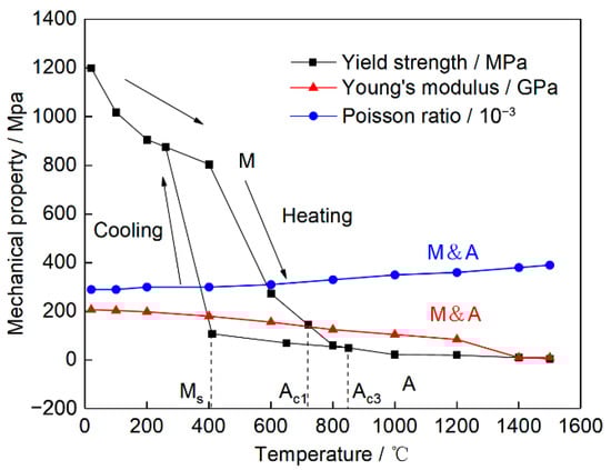 Due to the high strength of NM450TP wear-resistant steel, the effect of work hardening was not obvious. Thus, it was defined as an ideal elastic–plastic model [31,32] in the material model, and the effect of work hardening was not considered. The mechanical properties of NM450TP wear-resistant steel are shown in Figure 10. In Figure 10, the yield strengths at room temperature, 200 °C, 400 °C, 600 °C, and 800 °C were obtained by the tensile tests, and other material performance parameters were calculated by the JMatPro software through material composition. The initial state of NM450TP wear-resistant steel was the quenched martensite, and its yield strength decreased continuously during the welding heating process. Austenitization occurred in the interval from the Ac1 temperature to the Ac3 temperature. When the temperature was higher than Ac3, the martensite was completely transformed into the austenite phase, so the yield strength of the material was very low. During the cooling process, the austenite temperature decreased continuously, and the supercooled austenite phase formed when the temperature was lower, leading to the continuous increase of the yield strength. When the temperature was lower than Ms, the normalized martensite phase was formed due to the martensitic transformation, and the yield strength increased rapidly until it reached the yield strength of the initial phase.