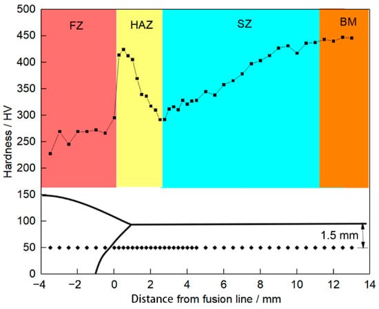 Figure 11 shows the microhardness distribution of the welded joint along L1. As can be seen from this figure, there was a wider softening zone (SZ) on the base metal side adjacent to the heat-affected zone. Since the base metal was quenched martensite, temper softening occurred in this area under heating of welding thermal cycling. The softening phenomenon near the heat-affected zone was severe, and its hardness value was 283 HV. The degree of softening decreased with increasing distance from the heat-affected zone. The maximum softening degree D calculated by the Formula (2) was about 40%.