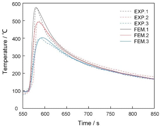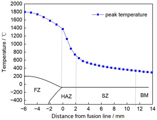 Thermal cycles at 3 mm, 5 mm, and 8 mm from the weld toe were measured. Figure 13 shows the calculated results and the experimental results. It could be seen from this figure that the peak temperature obtained by the experimental measurement was very close to the numerical simulation result, and the difference between the two was less than 10 °C. The curve of the heating part indicated that within 0 s to 25 s, there was a specific difference between the experimental value and the measured value in the heating speed. In the cooling part, when the time was 60 s, the difference between the experimental value and the measured value was the largest. The peak temperature distribution of the central section along L1 was extracted from the numerical simulation temperature field results and compared with the microhardness distribution of the welded joint along L1, as shown in Figure 14. It indicated that the highest peak temperature in the softening zone was 720 °C (Ac1), and the lowest peak temperature in the softening zone was 230 °C.