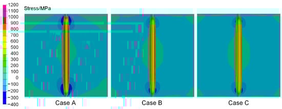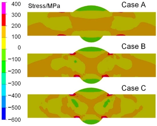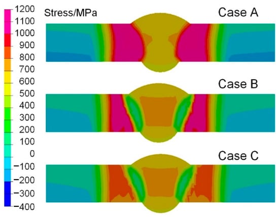 Figure 16 shows the longitudinal residual stress distribution in the central section of the NM450TP wear-resistant steel welded joint. In the heat-affected zone of Case A, the peak longitudinal tensile residual stress was close to the room-temperature yield strength of the NM450TP wear-resistant steel. As the distance from the weld increased, the residual stress gradually decreased and turned to compressive stress. Compared with Case A, the tensile residual stress in the heat-affected zone of Case B decreased significantly. This was due to the martensitic transformation of the heat-affected zone structure during the cooling process. The volume expansion reduced the tensile stress at this location so that the high longitudinal residual stress zone was significantly reduced. In the central section of Case B, the peak tensile residual stress appeared in the base metal adjacent to the heat-affected zone. Compared with Case B, the magnitude and distribution of longitudinal tensile residual stress in the heat-affected zone of Case C did not change significantly, while the peak value of longitudinal tensile residual stress adjacent to the heat-affected zone was significantly reduced.