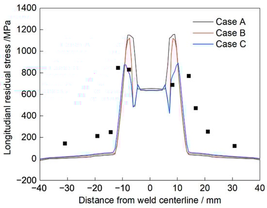 Figure 15 shows the longitudinal residual stress distribution on the upper surface of the NM450TP wear-resistant steel welded joint. It could be seen that the longitudinal residual stress in the three calculation cases was symmetrically distributed. Due to the geometric end effect [33], the longitudinal stress distribution at both ends of the joint was complicated. The distribution of longitudinal residual stress was nearly the same in the regions other than the two ends and their vicinity. The longitudinal residual stress distribution in Case B was different from that in Case A. The peak tensile stress on the upper surface of Case B was lower than that of Case A. In the central area of the upper surface, the tensile stress zone in Case B was wider than that in Case A. In addition, the compressive stress zone on the upper surface of Case B was different from that of Case A. From the comparison of the two, it could be seen that the solid-state phase transformation had a significant impact on the magnitude and distribution of the longitudinal residual stress calculation results. Compared with Case B, although Case C considered the softening effect, the longitudinal stress distribution on the upper surface had no significant change.