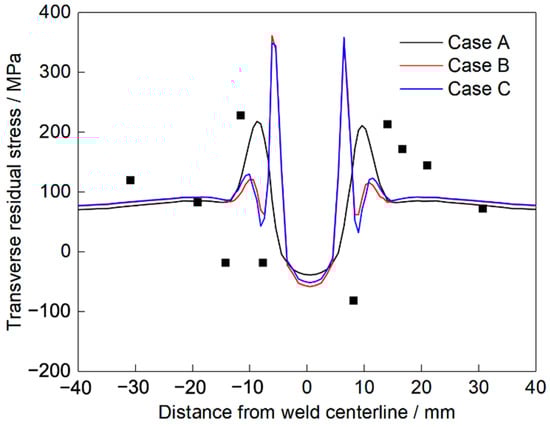 Figure 18 shows the transverse residual stress distribution on the upper surface of the NM450TP wear-resistant steel welded joint. The compressive residual stress zone in Case A and Case B were different with each other. From the comparison, it can be seen that the solid-state phase transformation influenced the calculation results of the transverse residual stress. Compared with Case B, although Case C considered the softening effect, there was no significant change in the transverse stress distribution on the upper surface of both cases.