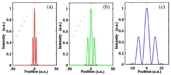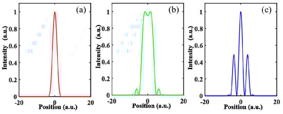 Figure 1 shows a waveform diagram of the initial Cos−Gaussian beam with different phases. At φ0 = π/6, it corresponds to a Gaussian beam whose waveform is a symmetrically distributed bell-type structure (Figure 1a). As φ0 increases, the Cos−Gaussian beam is strengthened by hyperbolic cosine function modulation, symmetrical side lobes modulated by the cosine function gradually appear on the left and right sides of the beam, and the main peak begins to split (Figure 1b). When φ0 is further increased, the waveform of the Cos−Gaussian beam is a symmetric trimodal shape with a larger intermediate peak (Figure 1c). The reason why the initial phase energy affects the waveform of the Cos−Gaussian beam and generates the multi-peak structure is that the Cos−Gaussian beam is a superposition of two Gaussian beams with different phases, and multiple Cos−Gaussian beams can be reshaped by controlling the phase factor.