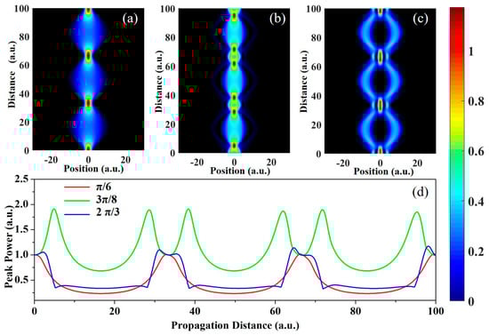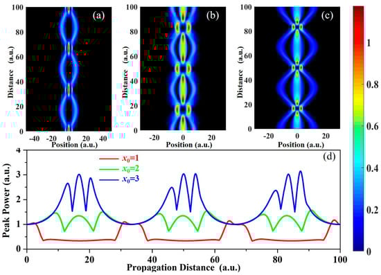 The initial width x0 is a degree of freedom controlling the spacing between the peaks of the multipeak Cos−Gaussian beam, and numerical simulation studies are performed to explore the effects of the initial width on the breathing solitons produced by the Cos−Gaussian beam. Figure 4 shows the evolution of the space domain waveform and peak power of the Cos−Gaussian beam with different widths. The Cos−Gaussian beam demonstrates a multipeak structure at φ0 = 2π/3, whose energy is mainly distributed in the main lobe while the side lobe energy is relatively weak. Although the initial width of the beam cannot change its shape, it can change the spacing between the different peaks of the Cos−Gaussian beam. While the nonlinearity is a near-field interaction, the magnitude of the interaction force depends on the spacing of the peaks. Different peaks of the Cos−Gaussian beam will attract each other. At x0 = 1, the breathing solitons exhibit an intertwined DNA structure under the combination of the cosine potential and the diffraction effects (Figure 4a). When the initial width increases, the energy of the main lobe converges to the central position to form a breathing soliton, and the side lobe radiates outward due to the weak attraction. Meanwhile, the energy of the side lobe rebounds after encountering the potential well, forming three breathing solitons (Figure 4b,c). In addition, the peak power evolution of the breathing solitons shows that as the beam width increases, the breathing frequency of the breathing solitons do not change significantly, but their maximum peak power of breathing gradually increases (Figure 4d); the maximum peak power of the breathing solitons remains stable, indicating that the outward energy can rebound well without energy loss.