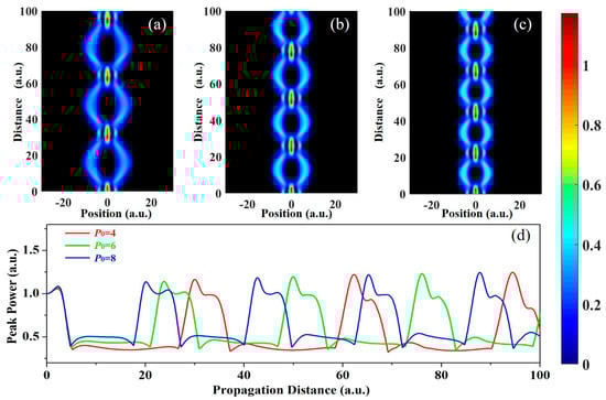 When x0 = 1, φ0 = 2π/3, ω0 = 0.03, the spatial evolution of Cos−Gaussian pulses with three different modulation intensities: (a) P0 = 4, (b) P0 = 6, and (c) P0 = 8; (d) the peak power evolution of the breathing solitons: P0 = 4 (red line), P0 = 6 (green line), and P0 = 8 (blue line).