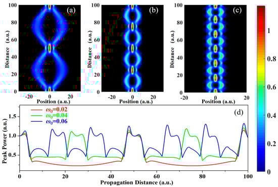 When x0 = 1, φ0 = 2π/3, P0 = 10, the spatial evolution of Cos−Gaussian pulses with three different modulation frequencies: (a) ω0 = 0.02, (b) ω0 = 0.04, and (c) ω0 = 0.06; (d) the peak power evolution of the breathing solitons: ω0 = 0.02 (red line), ω0 = 0.04 (green line), and ω0 = 0.06 (blue line).