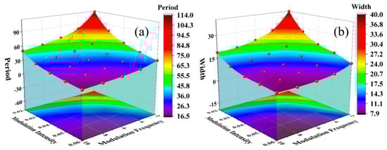 As can be seen from the diagram of the relation between the period and width of the breathing solitons formed by the Cos−Gaussian beam and the modulation intensity and frequency, the breathing cycle of the breathing soliton increases monotonically with the increase in the modulation intensity and modulation frequency (Figure 7a); meanwhile, the maximum width of the breathing solitons also has the same pattern (Figure 7b). Constructing different optical lattice structures with different modulation intensities and modulation frequencies can modulate the period and maximum width of breathing solitons, which plays a guiding role in the study of optical communication devices such as optical switching.