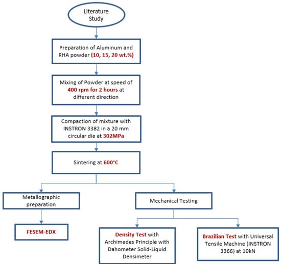 Three different samples were prepared with three different RHA compositions including RHA-10 wt.% and Al-85 wt.%, RHA-15 wt.% and Al-80 wt.%, and RHA-20 wt.% and Al-75 wt.%, as referred to by Shaikh et al. []. Each bulk sample was added to 5 wt.% magnesium stearate, which acts as the binder, before moving on to the ball-milling process. The prepared samples were homogeneously mixed using a planetary micro mill-pulverisette 6 (PM 100, Retsch, Haan, Germany) at a rotation speed of 400 rpm for 2 h with alternating directions (1 h clockwise and 1 h anticlockwise) in zirconium oxide (94.2% ZrO2) grinding bowls and balls with a ball to powder ratio of 14:1. The bulk samples were then divided individually into containers with each container consisting of a total specimen amounting to 4 g. The mixed powders were then compressed within a cylindrical die with a diameter of 20 mm using an Instron universal testing machine (INSTRON 3382, Shandong, China) at a compaction pressure of 302 MPa, which is equivalent to 95 kN. The compacted samples were eventually transferred for the sintering process with the assistance of the Carbolite Furnace. The major reduction in RHA was observed at the range of 560 to 600 °C following the Thermogravimetric Analysis (TGA) of RHA [], whereas the TGA of the aluminum shows that the melting point of aluminum falls around 660 °C [], thus the sintering temperature was set at 600 °C to ensure the removal of reinforcement material while avoiding the possibility of forming molten aluminum due to unintended melting. Therefore, the samples were, in the end, sintered at a temperature of 600 °C with a holding time of 20 min and a heating rate of 4 °C/min. Figure 2 shows the flow chart for the entire process of fabrication as well as the testing in this study.