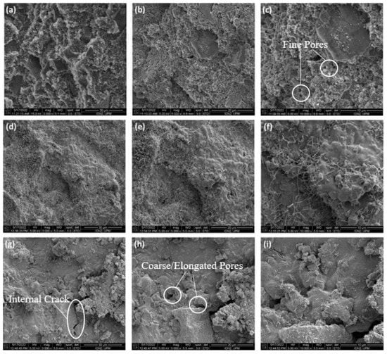 FESEM images of aluminum samples’ cross-sections with magnifications of 3000×, 5000×, and 10,000× from left to right. (a,d,g) RHA-10 wt.%, (b,e,h) RHA-15 wt.%, (c,f,i) RHA-20 wt.%.