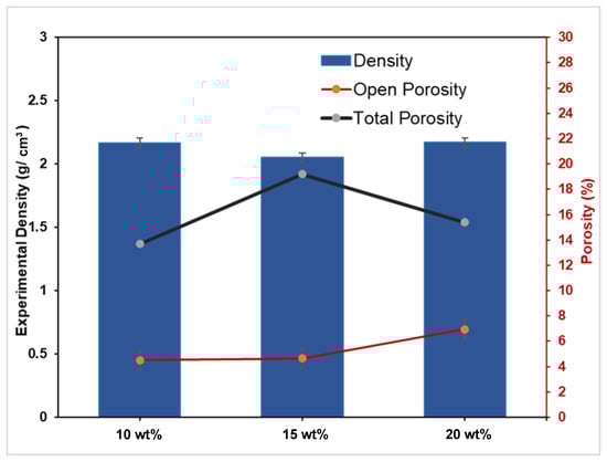 However, an interesting trend was observed when the RHA composition increased from 15 wt.% to 20 wt.%, where the total porosity of RHA-20 wt.% was observed to be reduced by approximately 4% with an increasing density of around 5 % when compared with RHA-10 wt.%. However, by observing the open porosity of each composition, the open porosity was recorded to be increasing at a steady rate from 4.52% to 4.64% and 6.95% for RHA compositions of 10 wt.%, 15 wt.%, and 20 wt.%, respectively. The obtained results indicate that although sintering may result in the densification of the specimen, thus leading to the elimination of holes within the sample matrix, a porous metal matrix typically consists of two different types of formed voids or channels which are known as open pores and closed pores, where the elimination of either one might lead to the deterioration of the total porosity of a produced or fabricated sample. Nevertheless, by visual inspection, a large crack was observed in Figure 3 for RHA-20 wt.%, which may also lead to obtaining results with high uncertainty and low accuracy, including the production of higher open porosity in comparison with RHA-10 wt.% and RHA-15 wt.%. The formed crack may be associated with the failure to consolidate the powder mixture during the powder compaction phase, which can be caused by several factors that result in the production of cracks and failures during the ejection phase []. To summarize, the trend of increasing porosity with decreasing density was observed as the RHA composition increased in each respective trial. Figure 4 illustrates the graph of experimental density and open porosity against the RHA composition of the fabricated aluminum metal matrix composite.