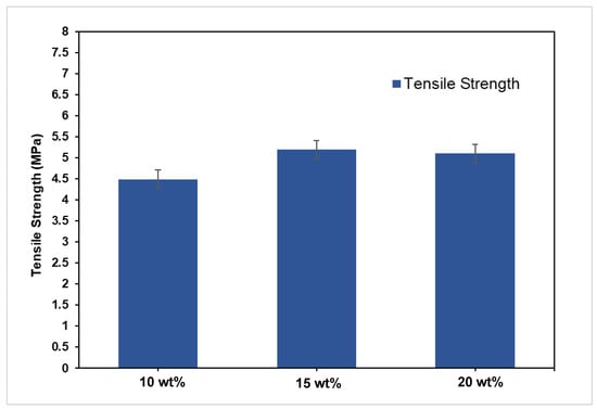The tensile strength and orthogonal stress for each specimen can be evaluated using Equations (1) and (2). The average tensile strength for each composition was found to be 4.49 MPa, 5.19 MPa, and 5.10 MPa for RHA compositions of 10 wt.%, 15 wt.%, and 20 wt.%, respectively, with orthogonal stress increasing from 15.30 MPa to 15.56 MPa before decreasing to 13.46 MPa. The results were found to be aligned with the trend of obtained density and porosity, which affirms that increasing porosity typically affects the overall tensile strength of aluminum metal matrix composite due to the formation of a greater number of pores within the target matrix during the powder metallurgy phase. Apart from that, the dropping trend of mechanical strength upon reaching 15 wt.% was also obtained by Khamsuk et al. []. Regardless of other parameters, it is then assured that as the porosity increases or decreases, tensile strength tends to react similarly due to their directly proportional relationship. Apart from that, it was interesting to note that similar to density and porosity, RHA-20 wt.% tends to react differently in a negative trend, which can again be referred to as the result of several factors from errors during the ejection phase of the compaction process to the ununiform geometry of our involved samples. Nonetheless, the trend of decreasing tensile strength with increasing RHA composition was determined along with the relationship between tensile strength, density, and porosity. Figure 5 shows the changes in average tensile strength for each sample with increasing RHA composition during Brazilian Testing.