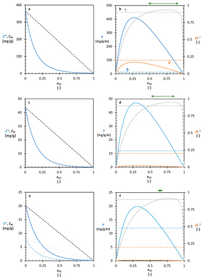 Here we also account for the antisolvent fractions in the solution feed and antisolvent feed which might deviate from xASF = 0 and xASAS = 1, respectively. The dashed straight line in Figure 6 represents the dilution line CM(xAS) = CF(1 − xAS) for a process with a feed of solute in pure solvent, saturated at the process temperature (CF = C*(xASF = 0, T)), and a feed of pure antisolvent (CAS = 0, xASAS = 0) at the same temperature. Only at an antisolvent fraction at which the overall concentration CM is higher than the solubility C* (the dilution line is above the solubility line), overall supersaturation is created and antisolvent crystallization can take place [37].
