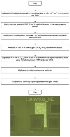 4H-SiC, with an epilayer approximately 1 um thick with an Aluminium concentration of cm (4 off-axis, Si-face, and an n (substrate)/p/p wafer supplied by Cree or Wolfspeed) were used as a starting material for the fabrication of the MOSFETs. Multiple nitrogen implantations with a cumulative dose of 9.8 × 10 cm were used to form the source and drain regions at room temperature. A carbon capping procedure was used to anneal the implants in an Argon environment at 1700 C for 10 min [16]. The carbon cap was removed in a low energy oxygen plasma. After surface cleaning in buffered HF (hydrofluoric acid), the ohmic contacts for the source and drain implants were formed by depositing titanium (5 nm) and nickel (100 nm) metal films. These contacts were then annealed at 1050 C in forming gas, (3% H in N) to form nickel silicide [17,18]. Trimethylaluminum (TMA) and water (HO) were used to produce a layer of AlO with a thickness of 40 nm by performing atomic layer deposition at 200 C in a chamber pressure of 600 mTorr. The AlO layer was etched to create the source and drain contacts. Then, tungsten was physically vapor-deposited to form the gate contacts, which were then shaped using a lift-off technique. The thickness of all materials was also confirmed using Atomic Force Microscopy (AFM). The alignment process of each step in the fabrication of 4H-SiC MOSFET was performed using Karl Suss MJB-3 mask aligner with a maximum resolution of 1 um. Figure 1 shows the summarized process used in the fabrication of 4H-SiC MOSFET and an image of the final 4H-SiC MOSFET taken under an optical microscope.