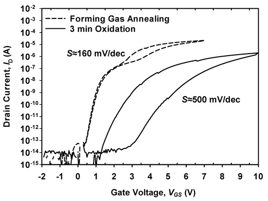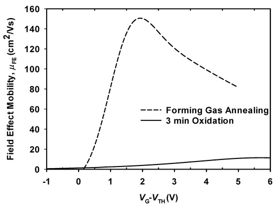 The forming gas sample exhibits a massive improvement in the field effect mobility, with a peak field effect mobility of 150 cmVs, while retaining a positive threshold voltage of 2.5 V. The thin oxide sample, in comparison, exhibits a maximal field effect mobility of around 20 cmVs. The improvement in the field effect mobility may be linked to the suppression of carbon cluster (ON1/ON2 defects) formation in the near-interface region during the hydrogen passivation process [23]. It has also been shown that hydrogen passivation lessens stress relaxation and Coulombic scattering at the SiC–dielectric contact [24,25]. Our findings are in strong accord with those of Okuda et al. [26], who found that H annealing at temperatures over 750 C increases the carrier lifetime in p-type 4H-SiC epi-layers. It is also believed that hydrogen etching of the SiC surface occurred during the forming gas annealing, resulting in the reconstruction of the SiC surface suitable prior to AlO deposition [27,28].