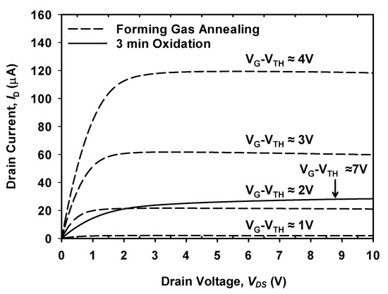 The results in Figure 2 depict the drain current () as a function of gate voltage () for both MOSFETs obtained at room temperature with = 100 mV. The threshold voltages, of 2.5 V and 5.5 V were obtained for the samples annealed in forming gas and thin oxide, respectively. Plots of vs. are shown in the subthreshold area, where 10 > 10. These were used to determine the values for the subthreshold slope, S. Samples annealed in forming gas show excellent subthreshold slope of 160 mV/dec, in comparison to a thin oxide sample with 500 mV/dec. The hysteresis in the drain current in the subthreshold region when swept forward and backward is negligible for the forming gas sample, in comparison to that obtained for the thin oxide samples. The origin of the negligible hysteresis in the subthreshold region is related to the reduced density of interface traps at the SiC/AlO as a result of the H passivation [20]. The hysteresis under strong inversion for both samples is due to defects in the bulk of the AlO gate dielectric as the same gate dielectric is present in both devices. In 4H-SiC MOSFETs, the interface state density is the main problem that deteriorates the channel mobility and causes the instability of the flatband voltage. The huge difference between both devices is in the preparation of the dielectric materials that greatly impact the device performance, such as field effect mobility, threshold voltage, and subthreshold slope. From the data in Figure 2, it was found that incorporating a new step prior to the deposition of dielectric material can reduce the interface state density, thus increasing channel mobility.