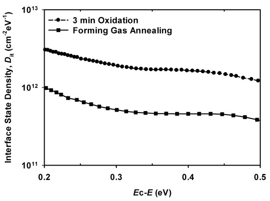The data in Figure 3 show a typical characteristic at = 3 to − = 6 V for the forming gas annealed sample and = 7 V for the device with the thin oxide layer. The forming gas sample exhibits a six-fold enhancement in drain current at = 4 V than that observed in the thin oxide sample operating with a gate bias of = 7 V. The data in Figure 4 show that the forming gas annealing process reduces the interface state density by a factor of three for energies between 0.2 and 0.5 eV below the conduction band edge, by means of hydrogen atom termination of Si and C atoms dangling bonds [21]. The density of interface states was extracted using the technique at room temperature. This technique allows the detection of very fast states, resulting in a more accurate profile in comparison to both the High-Low and Terman methods [21]. The at = 0.2 eV is below 1 × 10 cmeV, which is the lowest value reported for measurements on SiC using the technique [22].