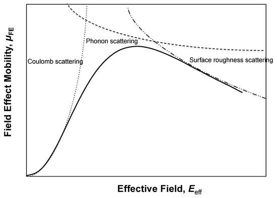 where is Coulomb mobility, is surface roughness mobility, is phonon mobility, and is bulk mobility. For 4H-SiC MOSFET, the bulk mobility scattering has a negligible influence on the field effect mobility because other scattering mechanisms are dominant at the oxide–semiconductor interface. Figure 6 shows the contribution of the three dominant scattering mechanisms that limit the field effect mobility. Under low electric fields, Coulomb scattering from the fixed and trapped charge at the SiC–SiO interface is the most prominent. Surface phonon scattering is the deflection of electrons by acoustic phonons at the semiconductor surface. However, this is it not the limiting factor for field effect mobility in 4H-SiC MOSFETs. The existence of step bunching on the surface of off angle 4H-SiC wafers makes the SiC–SiO interface very complex and rough, which results in a significant degradation of the field effect’s mobility under high electric fields, limited by surface roughness scattering. Electrons flowing in the channel (near or at the SiC–SiO interface) experience more surface roughness scattering at high electric fields (perpendicular to the surface) because electrons are strongly attracted to the SiC surface or interface as the electric field increases. Therefore, the field effect mobility is determined by the interplay of several mechanisms that are typically affected by device processing.