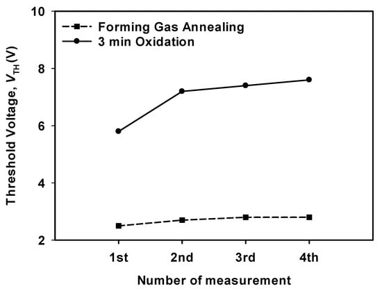 The − characteristics were repeatedly determined for gate voltages between = −2 and = 7 V to determine the stability of the threshold voltage. The data in Figure 7 show the shift in threshold voltage for both samples as a function of the number of measurements. The threshold voltage for both samples were extracted using the linear extrapolation method. The threshold voltage for the forming gas sample is consistent for each measurement, with a variation below 0.2 V; however, the data for the thin oxide sample show a significant shift in threshold voltage from ∼6 V to ∼8 V for the first and second measurements. The observed shift reduces on the third and fourth measurement because the interface traps become occupied during the first and second measurements. This effect is not observed in the forming gas-annealed sample, consistent with a lower density of trapping states in at the SiC–dielectric interface.