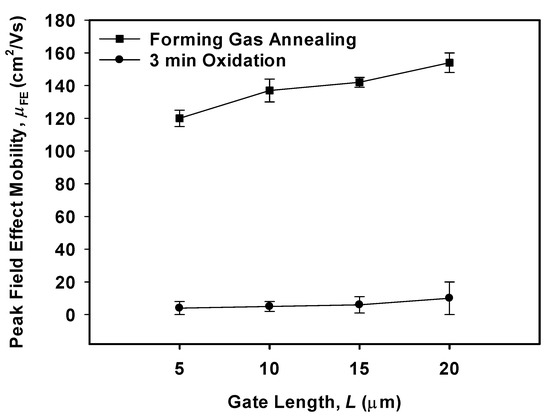 Peak field effect mobility of different MOSFETs as a function of gate length, L (5, 10, 15, and 20 m), with W= 100 m.