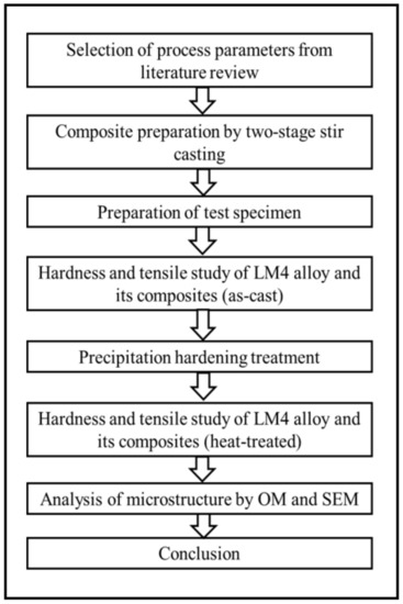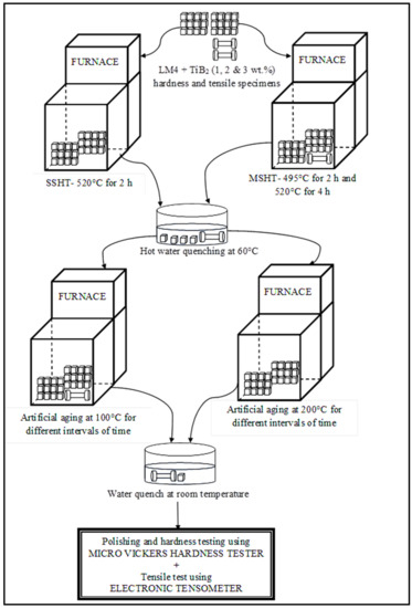 The detailed methodology used in the present study is explained in this section. LM4 + TiB2 composites were prepared using a two-stage stir-casting method, and age hardening treatment was carried out to check the peak hardness of cast composite samples and compare the hardness between heat-treated and as-cast samples of both the alloy and its composites.