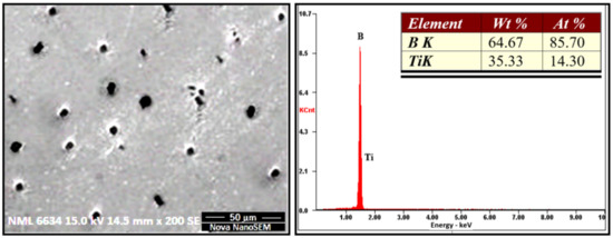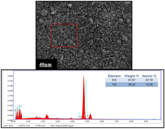 Therefore, based on the calculations, the quantity of foreign particles present in the alloy were extremely low (viz., 0.31%), indicating that the alloy was pure with almost no impurities and that almost 96% of the reinforcements were present in the matrix of the cast composite. The process of this chemical analysis test and the EDAX report of the powder collected are shown in Figure 10. The existence of the Ti and B elements was verified in the EDAX report of the powder collected, confirming the efficiency of the chemical analysis test.