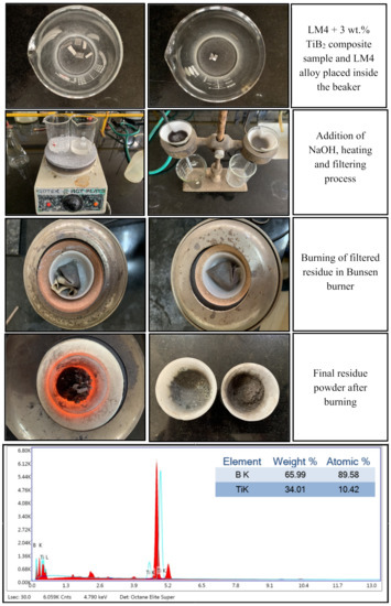 The LM4 alloy and LM4 + 3 wt.% TiB2 composite samples were subjected to a chemical confirmation test by dissolving these samples in concentrated sodium hydroxide (NaOH) to confirm the amount of reinforcement present in the 3 wt.% composites. Before testing, samples were heated at 100 °C to remove moisture, and initial weights were recorded. Samples were kept in separate beakers and were heated on a hotplate at 50 °C with 20% concentrated NaOH (about 125 mL) in them; this was heated until the acid boiled. The aluminum alloy dissolved in the acid completely during heating followed by 10 h of soaking. During boiling, the TiB2 reinforcement particles and other residues float on top of the acid’s surface. The residue formed after the complete evaporation of the aluminum was poured into ashless Whatman filter paper, and it was folded and placed in an oven at 100 °C for 2 h to remove the moisture. The initial weights of two crucibles were noted, and then, the filter paper was burnt in those crucibles by heating using a Bunsen burner at a high temperature (700 °C), then the residue powder was collected.