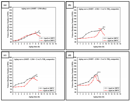(a–d) Aging curves of the precipitation-hardened (SSHT + artificial aging) LM4 alloy and its composites.