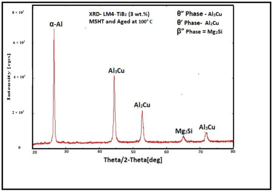 XRD of the LM4 + 3 wt.% TiB2 composite sample (MSHT and aged at 100 °C) to confirm the presence of different types of precipitates.