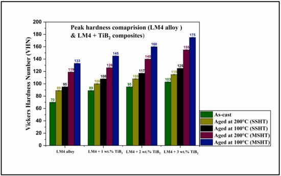 This paper aimed to determine the effect of MSHT and artificial aging on the mechanical properties of the LM4 alloy and LM4+ TiB2 composites. The following conclusions were drawn based on the results obtained: