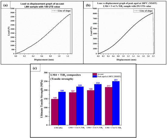 Tensile tests were conducted on as-cast, and peak-aged samples of the LM4 alloy and LM4 + TiB2 composites, and the tensile curves of the as-cast LM4 and peak-aged LM4 + 3 wt.% TiB2 composite are shown in Figure 15a,b, while the average values of the UTS readings of the as-cast and peak-aged samples are shown in Figure 15c. From Figure 15a,b, we can see that, for the as-cast LM4 sample, the peak load and peak displacement were found to be 4838 N and 1.26 mm, whereas for the peak-aged LM4 + 3 wt.% TiB2 composite sample, the peak load and peak displacement were found to be 8120 N and 2.19 mm. This increase in the peak load of the LM4 + 3 wt.% TiB2 composite sample and the strengthening behavior of the LM4 composites were due to the load-bearing capability of the reinforcement particles. The presence of hard reinforcement particles caused the improvement in the load bearing capacity of the composites. Reinforcements and dislocations caused improvement in the resistance to crack propagation [19]. The increase in the tensile strength of the composites was mainly because of intermetallic precipitates, which restricted the dislocation motion and reduced plastic deformation. Higher dislocation density resulted from higher particle concentration and lower aging temperature. Because of the applied load, the matrix had a restricted plastic flow; these hard intermetallics caused a dislocation pileup. The interaction of dislocations with reinforcement, intermetallic, and grain boundaries synergized the alloy strengthening [32]. From Figure 15c, it is observed that the composites displayed higher UTS values than the alloy in the as-cast, as well as in the peak-aged conditions. Compared to the as-cast UTS value of LM4, its composites with 1, 2, and 3 wt.% of TiB2 in the as-cast condition displayed a 25, 33, and 45% improvement; similarly, in the peak-aged (MSHT + aging at 100 °C) condition, a 47, 57, and 68% improvement in UTS was observed. Similar to the hardness results, the samples subjected to MSHT + aging at 100 °C demonstrated greater UTS values, with the composite containing 3 wt.% TiB2 having the highest.