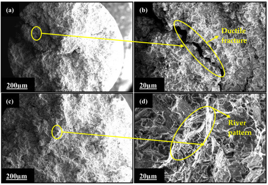 Fracture analysis of the (a,b) as-cast and (c,d) peak-aged LM4 alloy tensile sample.