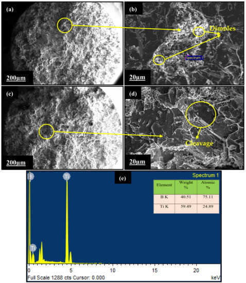 Figure 17a,b depict an LM4 + 3 wt.% TiB2 as-cast composite fracture surface. Compared to the LM4 alloy, there was a significant drop in dimple density. Fracture in a localized zone may be caused by shear, resulting in the creation of elongated dimples. The fracture mechanism observed in the peak-aged sample at 100 °C (Figure 17c,d) was a dimple rupture. Dimples form when multiple nucleation sites are activated, forming micro-voids and their subsequent coalescence. Nucleation sites can be inclusions, second phase particles, grain boundary dislocation pileups, and so on. The distribution of these particles/defects considerably impacts the fracture type [34]. The creation of dimples of varied sizes is caused by the non-uniform distribution of such particles/defects of varying sizes. In a few instances, there is also evidence of quasi-cleavage fracture [35]. Quasi-cleavage is limited and shows cleavage and plastic deformation properties (Figure 17d). In Figure 17e, the EDAX confirms the presence of Ti and B.