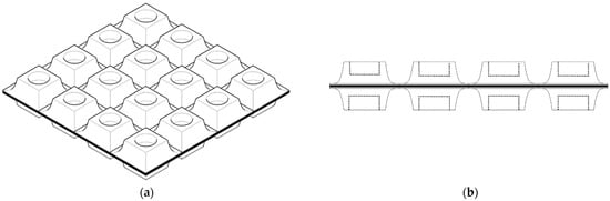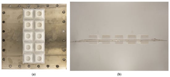 To verify the effectiveness of the band gaps of the symmetric power-exponent prismatic phononic crystal, a test model of the phononic crystal plate was prepared according to the parameters given in Table 1, as shown in Figure 10. The phononic crystal plate was composed of polycarbonate prismoids processed by a Raise3D Pro2 3D printer and one thin steel plate with dimensions of 300 mm × 300 mm × 0.5 mm. In the middle of the thin plate, ten 2 × 5 prismoids were bonded on the upper and lower sides, respectively, using a contact adhesive.