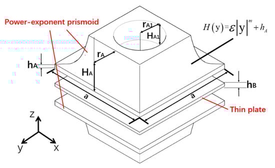 As shown in Figure 1, the proposed protocell of phononic crystal consists of two identical power-exponent prismoids and a thin plate, where the prismoids are attached to the upper and lower sides of the thin plate. The upper and lower end faces of the power-exponent prismoids are square in shape, and the prismoid faces bend inward, reflecting a power exponential curve. For the prismoid on the upper-end face, a cylindrical hole is set in the center of the face, as shown in Figure 2. The square side length of the power-exponent prismoid base is a, the edge thickness is hA, the edge height is HA, and the sag width is rA. The thickness change of the power-exponent prismoids in the X and Y directions follows the equations . Furthermore, the cylindrical hole in the center of the prismoid has a radius of rA1 and a depth of HA1. The length and width of the thin plate are consistent with those of the lower-end face of the prismoid, and its thickness is hB.