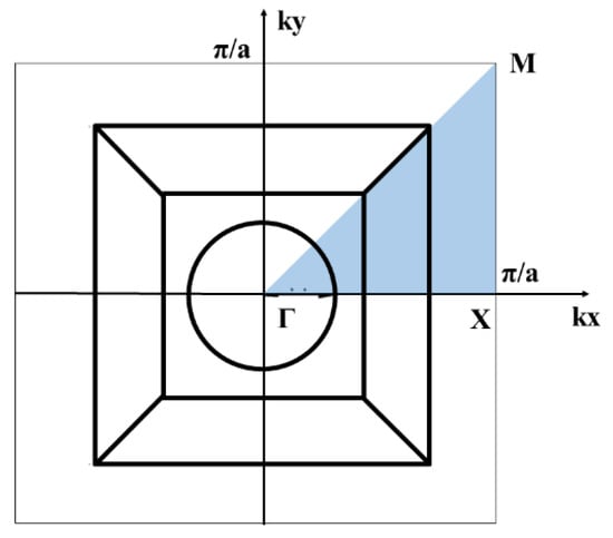 where k = (kx,ky) is the Bloch wave vector of the first Brillouin zone, R is the translation vector, and uk(r) is the vector function with the same periodicity. When the wave equation is solved by finite element software, periodic boundary conditions are applied at the boundaries of the phononic crystals, and the frequency dispersion curves can be calculated for a single cell structure. After meshing the model with finite elements, the eigenvalue equation of a single cell in the discrete form can be expressed as