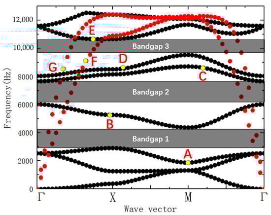 Three basic wave modes exist in the plate structures with finite thickness, namely, bending waves, longitudinal waves, and horizontal shear waves. These three modes can be expressed as A mode, S mode, and SH mode, respectively, and are related to their frequency order n (n ≥ 0), which can be written as An, Sn, and SHn (n = 0, 1, 2 …), respectively. In order to analyze the wave modes corresponding to the dispersion curves, the displacement components of the eigenmodes at A–G points in the dispersion curves in the x, y, and z directions are illustrated in Figure 5. Evident from the figure, the vibration amplitudes of the eigenmodes at the A, B, C, D, and E points in the z direction are greater than those in the other two directions (x and y). The displacement component of the eigenmode of point F in the y direction is much larger than that in the other directions, and therefore the wave mode corresponding to the frequency dispersion curve of point F is the horizontal shear wave. Similarly, the displacement component of the eigenmode of point G in the x direction is much larger than that in the other directions, so the wave mode corresponding to the frequency dispersion curve of point G is the longitudinal wave [31,32]. Since a thin plate structure produces large vibrations mainly in the vertical direction, the longitudinal wave in the plate that mainly vibrates in the x direction, and the horizontal shear wave that mainly vibrates in the y direction, are not the focus of this study; thus, the bending wave, which mainly vibrates in the z direction, is focused in this study. If other types of wave modes are hidden, it can be found that the proposed symmetric power-exponent prismatic phononic crystal has three complete band gaps of bending waves, and their frequency bands are shown in Table 2.