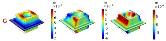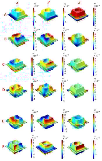 Displacement components of the eigenmodes at the (A–G) points in the dispersion curves in the x, y, and z directions.