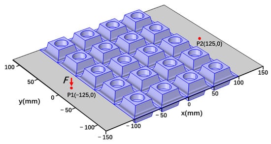 The dispersion curves can be used to predict the band gaps, and it is also necessary to analyze the transmission to verify the band gap characteristics of the phononic crystal, thus fully validating the vibration-reduction characteristics of the phononic crystal plate. As shown in Figure 6, the phononic crystal plate has a length of 0.3 m, a width of 0.25 m, and a thickness of 0.5 mm, and there are 4 × 5 phononic crystal protocells attached to the plate. Moreover, the clamp-supported constraints are applied around the phononic crystal plate, and the geometric and material parameters of the phononic crystal protocell are consistent with those listed in Table 1. Next, a harmonic excitation load F perpendicular to the plate is set at point P1 in the finite element software, and a domain point probe is set at points P1 and P2 in the vibration transmission model, to measure the acceleration amplitudes of the two points. In vibration research, the transmission loss curve is usually defined as