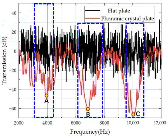 Based on the vertical acceleration amplitudes of point P1 and P2 calculated by the finite element software, COMSOL Multiphysics 5.5, the transmission loss curve of the vibration transmission model under the excitation frequency of 2000–12,000 Hz can be calculated using Equation (6), as shown in Figure 7. Evidently, compared with the flat plate structure, the phononic crystal plate has a better attenuation effect on the bending waves in the three frequency bands of 2653–4519 Hz, 6097–7888 Hz, and 9085–10,834 Hz. Additionally, the vibration transfer loss of the phononic crystal plate can reach −66 dB, while the energy attenuation bands are basically consistent with the bandgap frequency bands (blue dotted lines in Figure 7).
