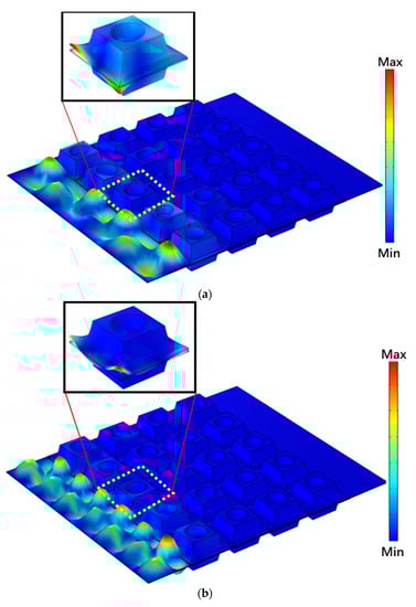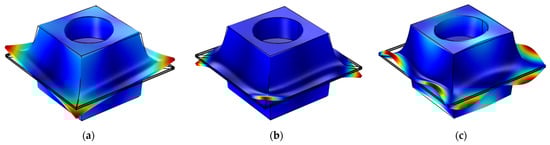 In order to better reveal the bandgap mechanism, the natural frequencies of the phonon crystal primitive cell were calculated. Here, the geometric and material parameters of the phononic crystal are consistent with those listed in Table 1. In the calculation of the natural frequency by the finite element software COMSOL Multiphysics, “solid mechanics” was chosen as the physical field type, “characteristic frequency” was chosen as the research object, and free boundary conditions were chosen as the boundary conditions of the phonon crystal, and its first-order natural frequency is 3923 Hz, corresponding to the frequency band of first band gap. From Figure 9, the vibration mode of the first-order natural frequency of the protocell indicates that the wave energy is mainly concentrated at the bevel edges of the prismoid. Here, the change in prismoid thickness can lead to the decrease of wavelength and the increase in bending wave amplitude, reducing the group velocity and phase velocity of the bending waves, which restricts the energy of the bending waves to the power-exponent bevel faces, i.e., producing the energy-focusing effect [31]. This illustrates that the first band gap is generated by local resonance caused by the energy-focusing effect [22]. Meanwhile, the fifth-order natural frequency of the phononic crystal protocell (6607 Hz) corresponds to the second band gap, and the tenth-order natural frequency of the phononic crystal protocell (9670 Hz) corresponds to the third band gap. The modal shapes of the natural frequencies of protocell provided in Figure 9 all show that the energy-focusing phenomenon occurs on the bevel faces of the power-exponent prismoid. To sum up, three complete band gaps generated by the symmetric power-exponent prismoid are actually generated through local resonance induced by the energy-focusing effect.