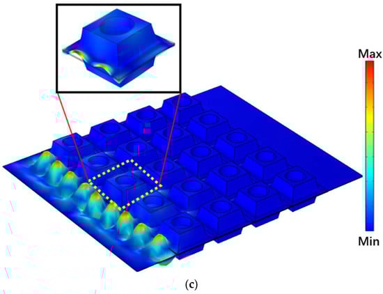 To further demonstrate the mechanism of bandgap generation in the symmetric power-exponent prismatic phononic crystal, the displacement fields at the transfer loss peak points, A (3913 Hz), B (6880 Hz), and C (10,066 Hz), in the three attenuation bands were calculated, and the results are reported in Figure 8. Based on the displacement field at point A, it can be observed that the bending vibration of symmetric power-exponent prismatic phononic crystal plate can be effectively suppressed in the frequency bands of the band gaps. From the extracted displacement field of the protocell structure of phononic crystal plate, the phononic crystal plate structure mainly produces the large displacement at the bevel edges of the prismoid.