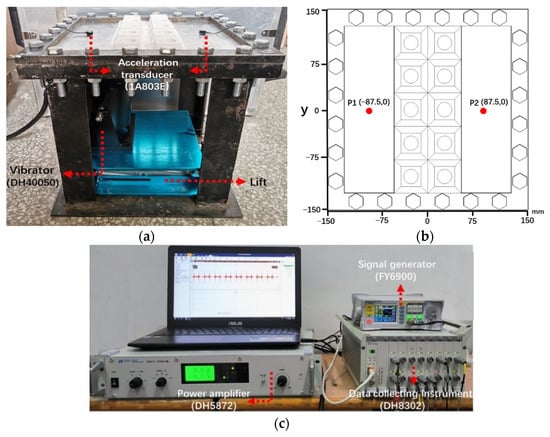 Then, the phononic crystal plate was fixed on a rigid support by bolts to simulate the clamp-supported constraints. Moreover, the vibrator (DH40050) and the lift were placed below the model. The height of the lift was adjusted so that the post rod of the vibration exciter could be placed below point P1 of the phononic crystal plate, to generate the vibration under excitation. A signal generator (FY6900) and a power amplifier (DH5872) were used to set the output excitation force of the vibration exciter. In addition, a miniature acceleration transducer (1A803E) was attached to points P1 and P2 of the phononic crystal plate, to measure the normal vibration acceleration at the two points. Figure 11 shows the overall test system.