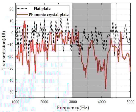 It can be seen from Figure 12 that the test model has an obvious energy attenuation band within the frequency band of 3186–4300 Hz, which effectively suppresses the bending vibration response of the thin plate. Moreover, this energy attenuation band is consistent with the frequency band of the band gaps (the gray zone), thus verifying the effectiveness of suppressing the bending wave vibration through the band gaps of bending waves of the symmetric power-exponent prismatic phononic crystal. In addition, the test sample also has a certain vibration attenuation effect in the frequency band outside the band gaps, since the energy-focusing effect generated by the power exponent profiles of the phononic crystal suppresses the bending vibration of the plate. Furthermore, the experimental results show that the vibration-reduction effect of the phononic crystal plate in the frequency band of the band gaps is better than that in the frequency band without the band gaps.