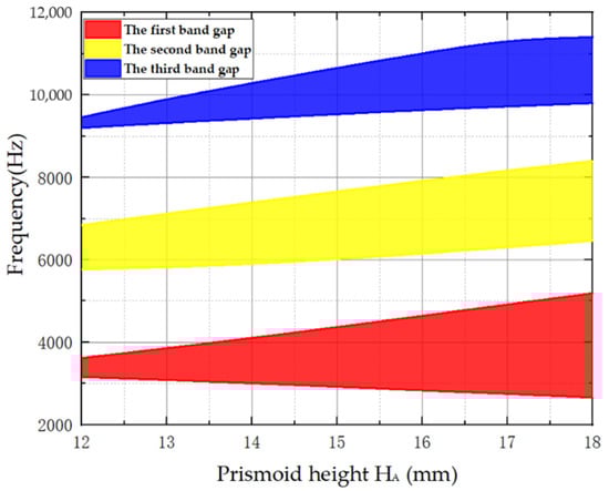 Figure 13 shows the influence of the height of the power-exponent prismatic phononic crystal on the band gaps. Here, only height HA of the phononic crystal cell is changed, while the other parameters are consistent with those in Table 1.